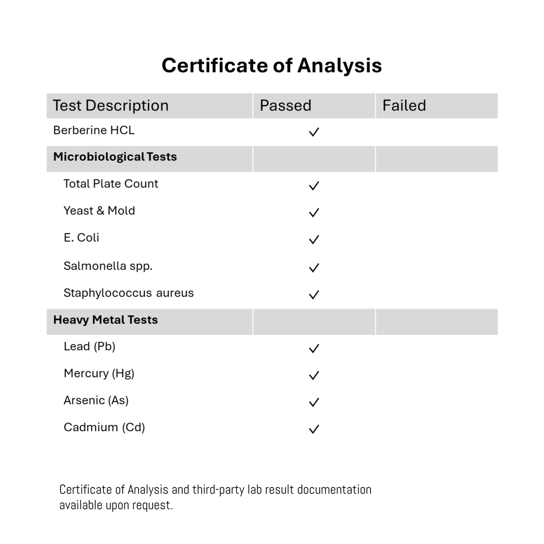 Our product is tested for micro, heavy metals and strength by third party labs.